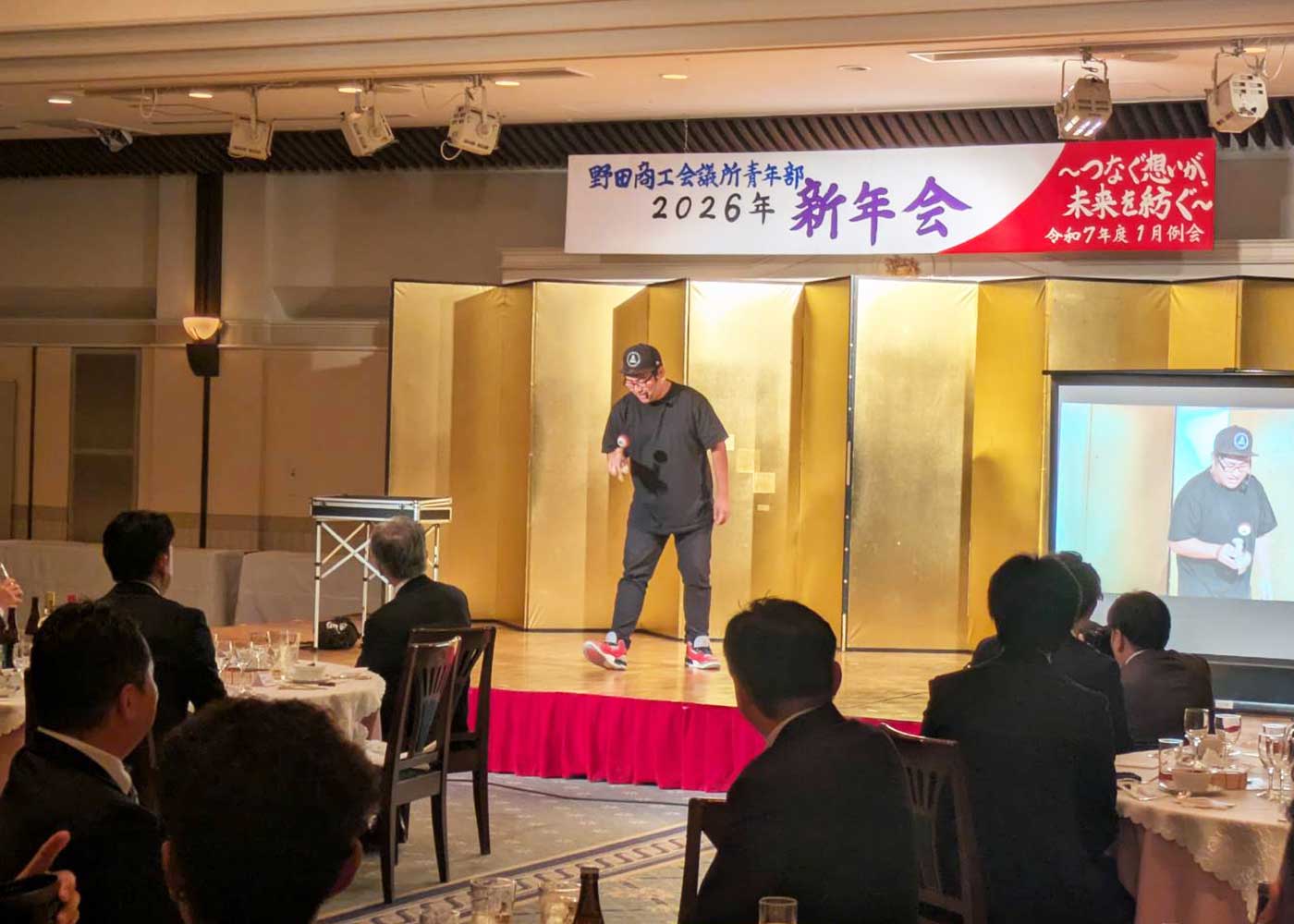 本年度の新年会では、余興として、けん玉世界チャンピオンであるけん玉パフォーマー「ゆーだまさん」をお招きし、迫力あるパフォーマンスをご披露いただきました。正月の伝統的な遊びでもある「けん玉」を通じ、世代や立場を越えて会場全体が一体となる、活気あふれる時間となりました。